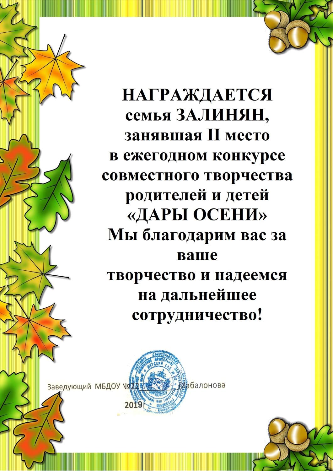 Благодарственное письмо Хабалоновой Л. В.